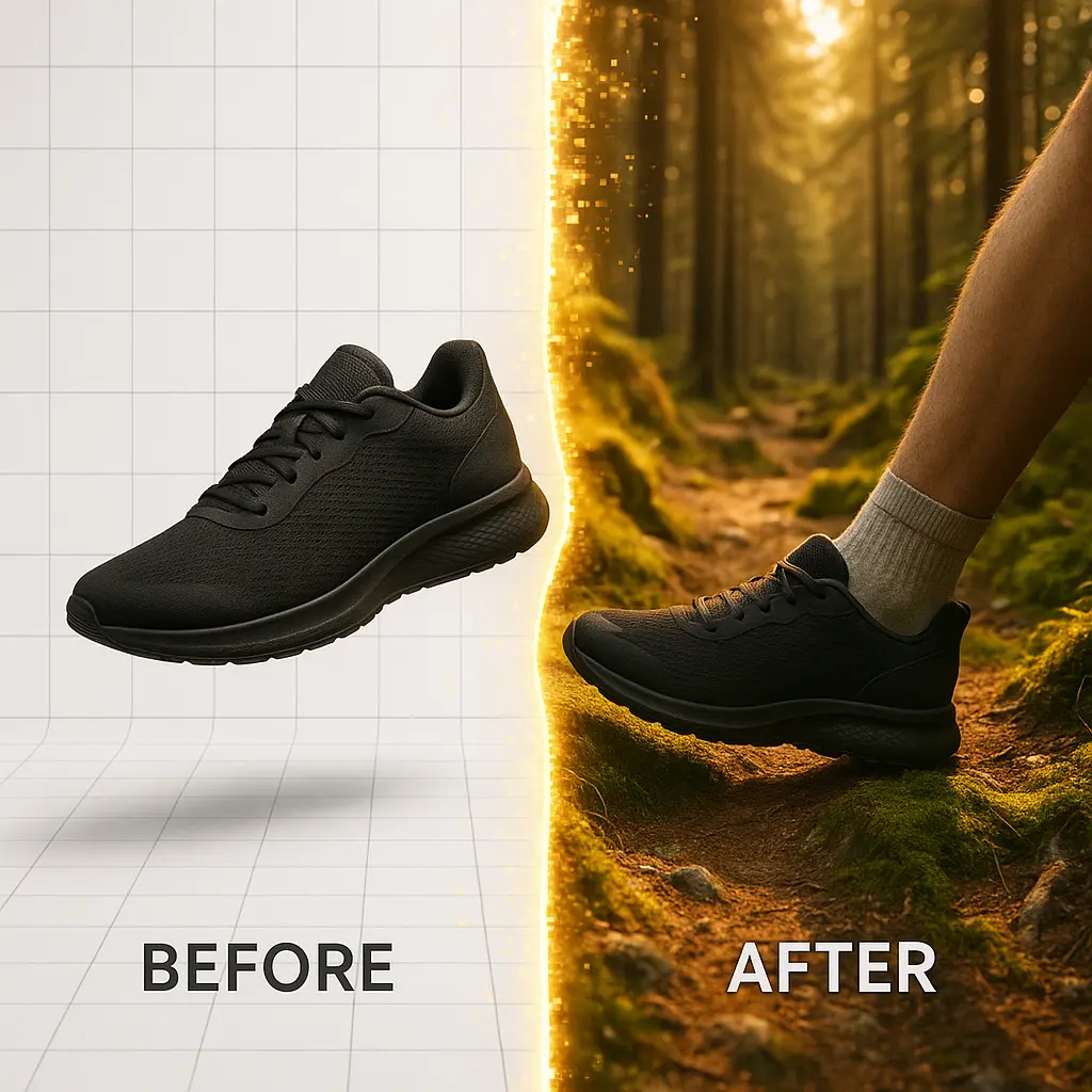 3. יצירה (Generate): הבינה המלאכותית מעבדת את התמונה, שומרת על צורת המוצר המקורי, ויוצרת סביבה חדשה לחלוטין (יער, רחוב, סטודיו).