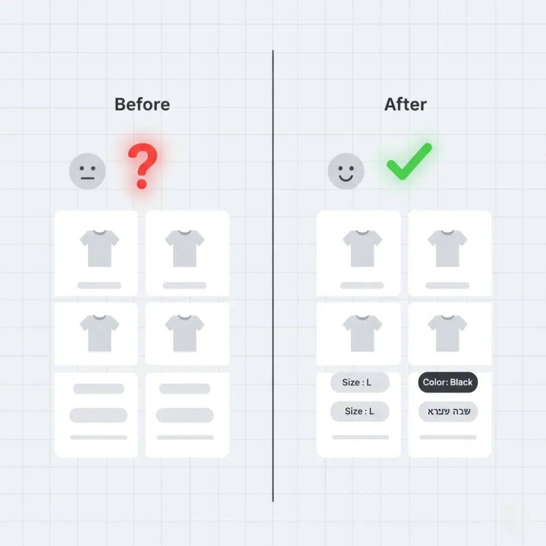 דמיינו לקוח שמגיע לחנות שלכם. הוא מחפש חולצת כותנה שחורה במידה L. הוא נכנס לעמוד קטגוריית החולצות ורואה רשת של 20 תמונות כמעט זהות. כדי לגלות את המידה, הצבע והחומר של כל אחת, הוא נאלץ לפתוח 10 לשוניות נפרדות, לקפוץ קדימה ואחורה, ולנסות לזכור איזה מוצר היה מה. בסופו של דבר, הוא מתייאש ונוטש.